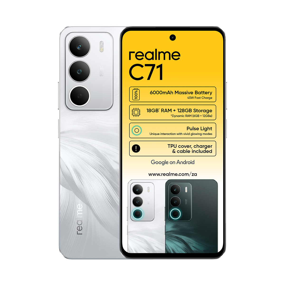 The Realme C71 128GB Dual Sim features a 6.7-inch display, a 50MP main camera, a 5MP front camera, a 6000mAh battery, 6GB RAM plus 12GB virtual RAM, and 128GB storage.