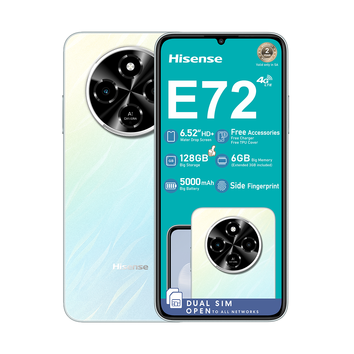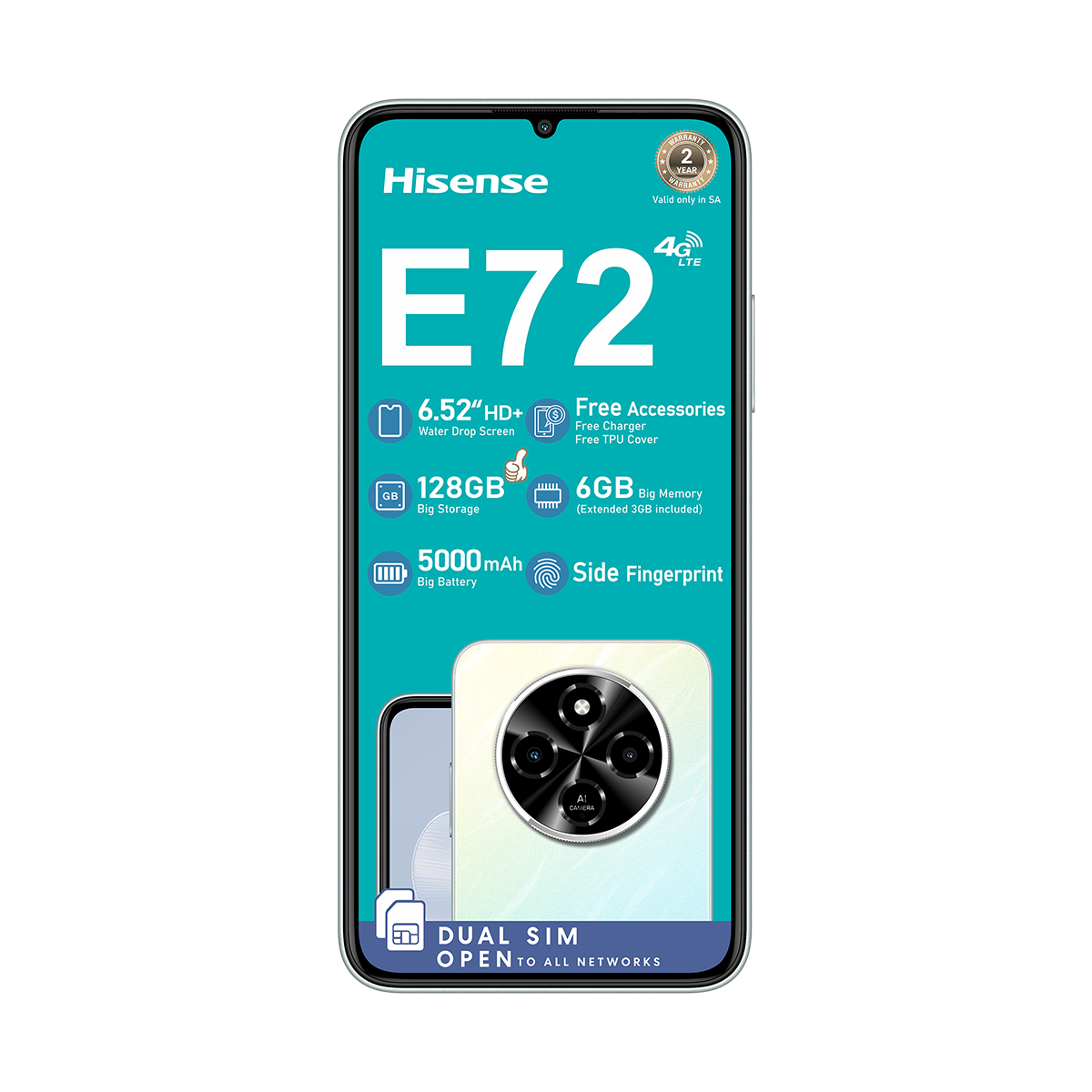 The Hisense E72 128B Dual Sim features a 6.52-inch display, dual 8MP cameras, 3GB RAM plus 3GB virtual memory, 128GB storage and 5000mAh battery for reliable performance and ample storage.