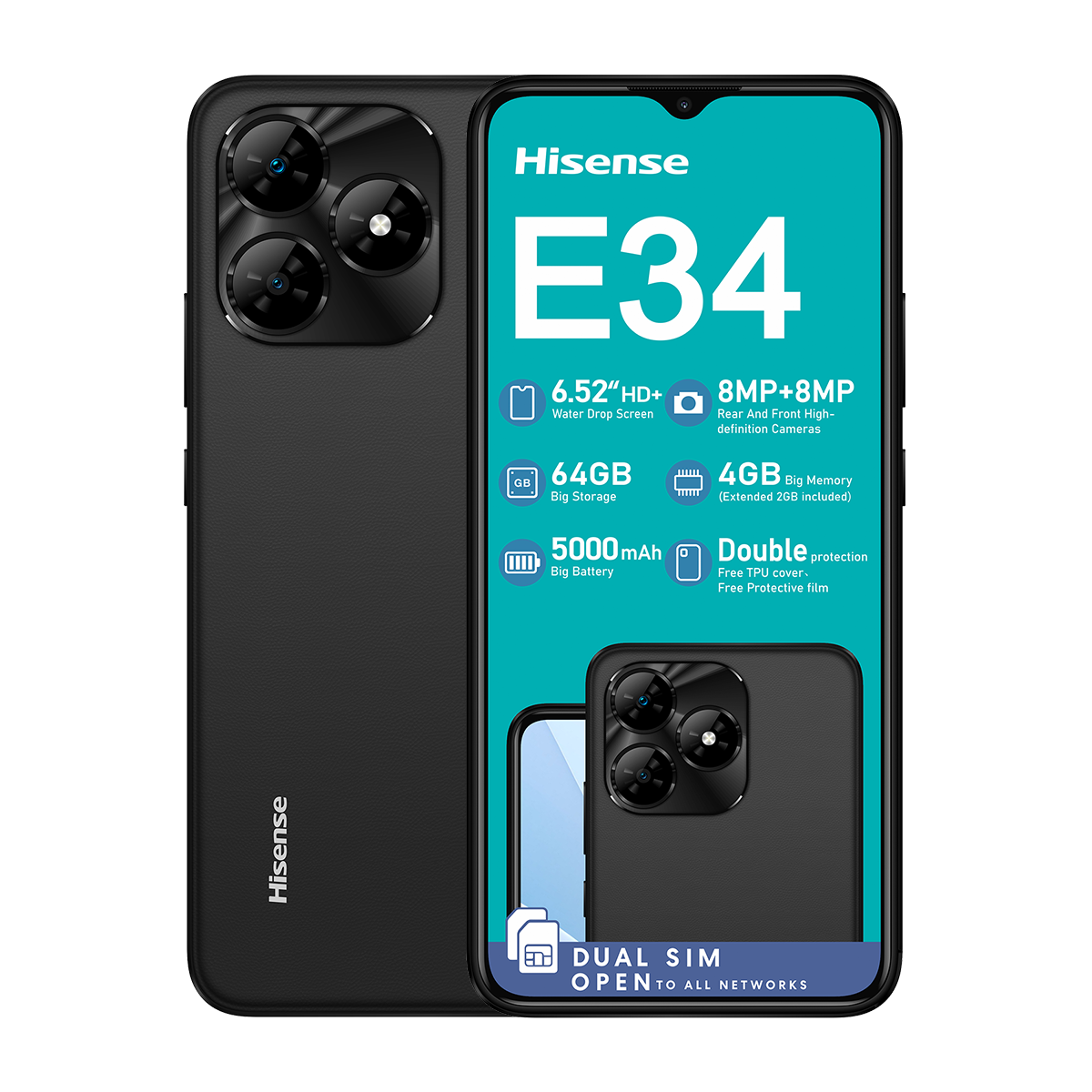 The Hisense E34 64GB DUAL sim features a 5000 mAh battery and 64GB ROM + 4GB RAM. dual rear (8MP + CIF) and front 8MP cameras and a 6.52 Inch screen. Stay connected with dual sim capabilities.