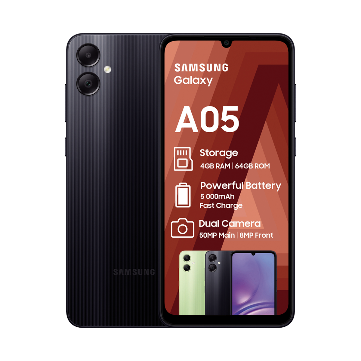 The Samsung Galaxy A05 features a long-lasting 5000mAh battery and a powerful dual camera system with a 50MP main camera 8MP selfie camera for stunning photos, 64GB of storage and 4GB of RAM, and 6.7 inch screen.