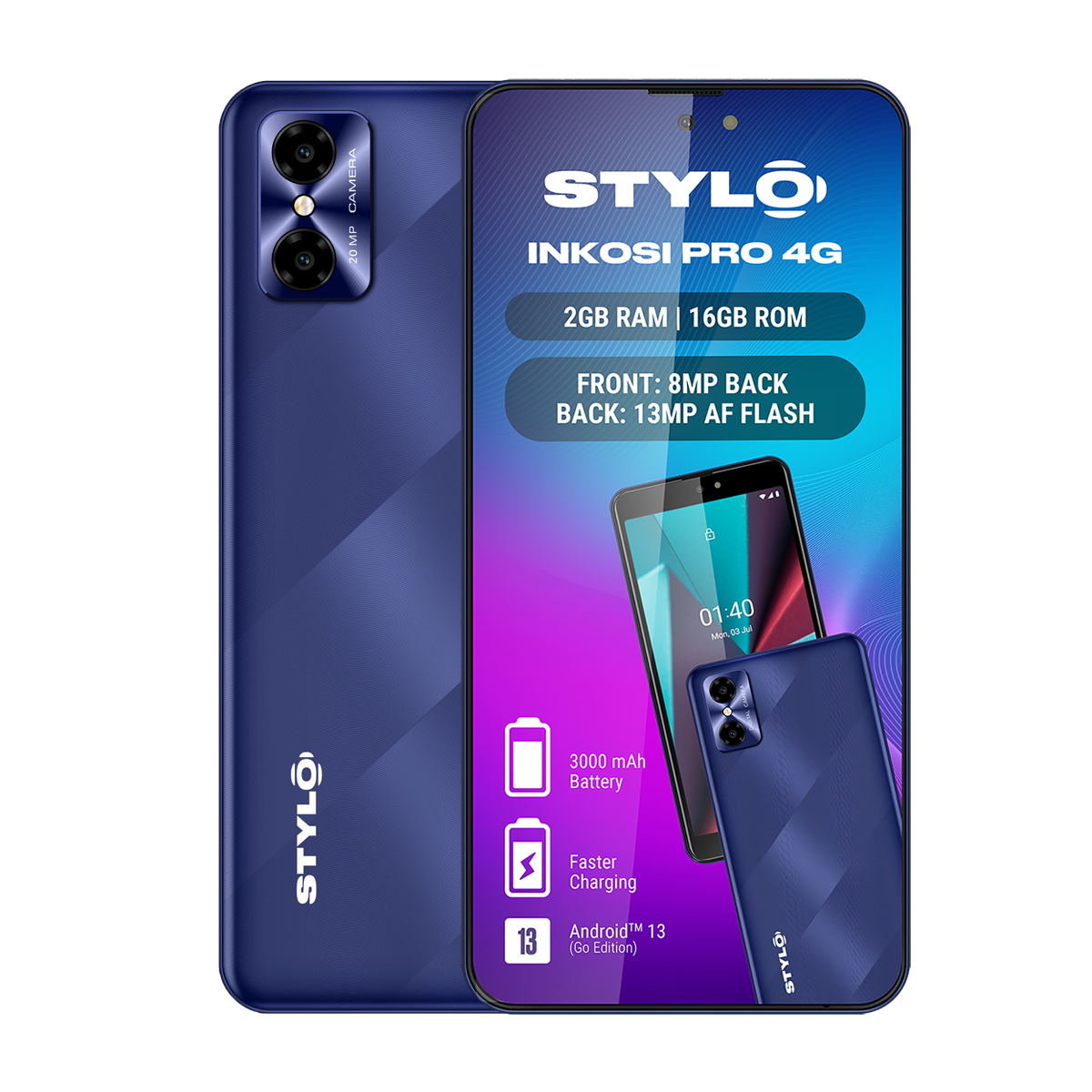 The Stylo Inkosi Pro 4G Dual Sim boasts a long-lasting 3000mAh battery and a 6 inch screen for an immersive viewing experience. 8MP rear camera and 5MP front camera, with 16GB of storage and 2GB of RAM.