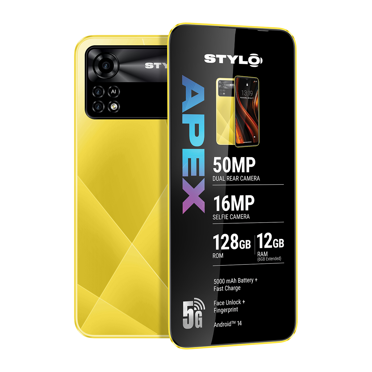 Stylo Apex 128GB Dual Sim Sunset Yellow offers a stunning 6.8 inch display and powerful 50MP main camera and 16MP front camera with 6+6 RAM and 128GB storage and long-lasting battery life of 5000mAh.